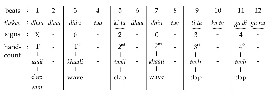 2. タールのビートは、特定の方法によりグループ分けされている。そのグループのことを、カンダ(khanda)と呼ぶ。(ティーンタールは4カンダあり、それぞれのカンダには4ビート入っている)