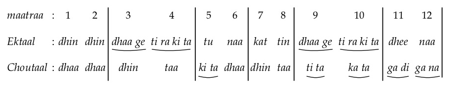 ダー(dha)、ゲー( ghe)、ティラキタ( tirakita)、ディン( dhin)、ティン( tin)、ナー( naa)といったさまざまなボル(音節)が、ビートを識別するために使用される。