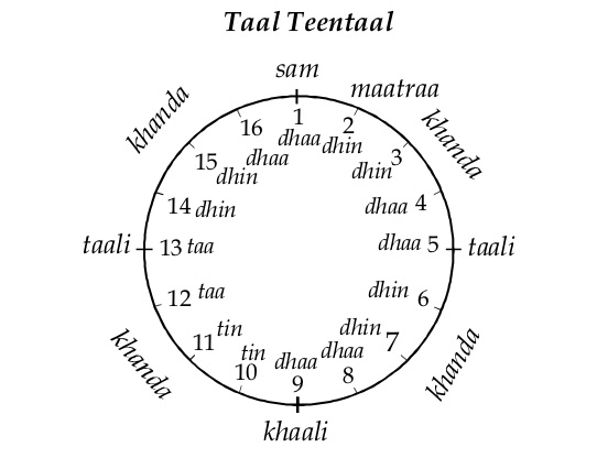 インド音楽において、音楽的時間の基本単位は、マートラー(西洋音楽における、“ビート”)と呼ばれ、測定される。ビートがパターンをともない配置されると、それはTaal、タールと呼ばれる。(西洋音楽における、“メーター”)